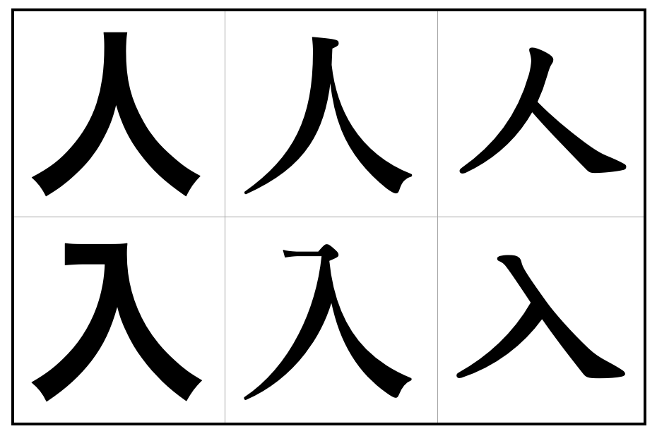 L’image ci-contre va vous aider à comprendre. Sur la première ligne on trouve 人, et c’est 入 qui figure sur la deuxième. Chacun de ces kanji est typographié dans 3 styles différents, colonne par colonne.